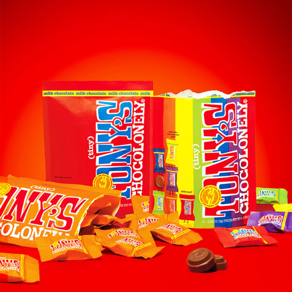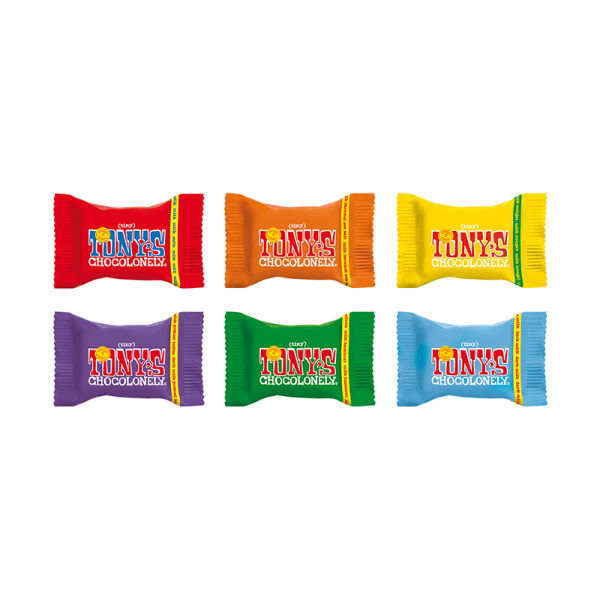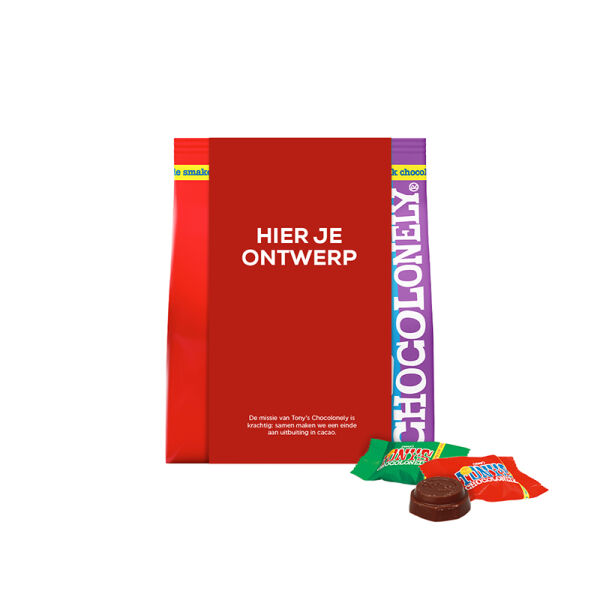 De Tiny Tony’s Chocolonely pouch krijgt een eigen wikkel met jouw logo en eigen tekst1 De wikkel wordt bedrukt aan 1 zijde in full color met compleet eigen ontwerp.