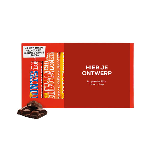 Lastig een smaak chocolade te kiezen? Geen probleem! Met het Tony’s regenboogpakketje krijg je alle zes de kleine reepjes. Zo kun je alles proeven, of delen met klanten, collega’s of je partner of gezin thuis.