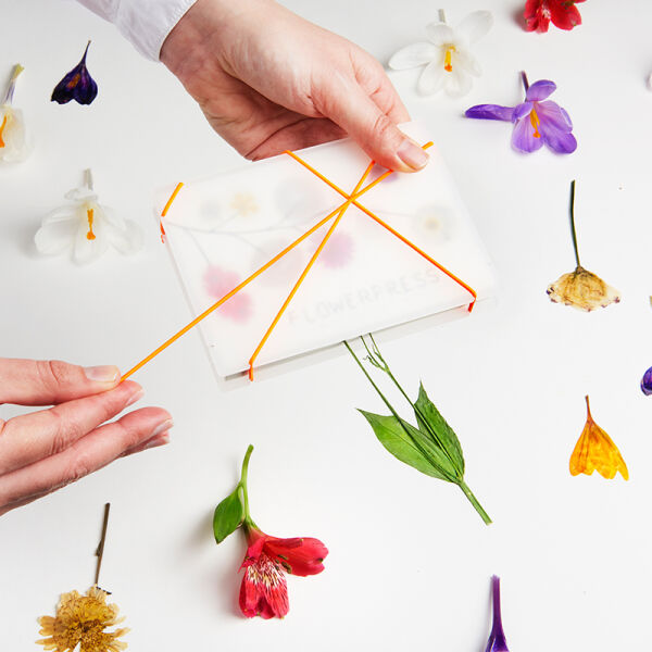 De Pocket FlowerPress is verkrijgbaar in de kleur Ghost White en Pink Blush en is voorzien van een fluoriserend oranje koord die ervoor zorgt dat je de bloem makkelijk kunt persen.