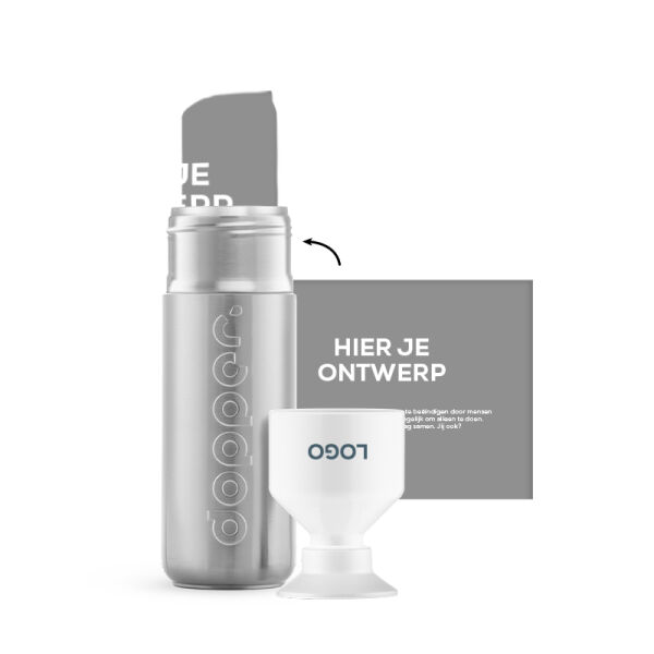 | Bedrukkingsinformatie | Jouw logo of tekst wordt bedrukt op de cup van de Dopper. Tamponprint in 1 of 2 kleuren formaat 30 x 35 mm (horizonaal of verticaal) of Digitaal bedrukt in full colour van klein formaat tot rondom de cup. |