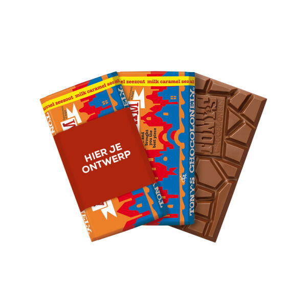 Om de Exclusive reep komt een smalle of brede wikkel. met compleet eigen fullcolour design. Wij verpakken deze om de originele verpakking, zodat je een echte Tony's Chocolonely weggeeft, met een eigen boodschap! Dat is nog eens leuk geven!