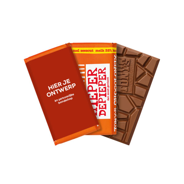 Om de Exclusive reep komt een smalle of brede wikkel. met compleet eigen fullcolour design. Wij verpakken deze om de originele verpakking, zodat je een echte Tony's Chocolonely weggeeft, met een eigen boodschap! Dat is nog eens leuk geven!