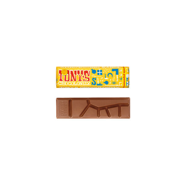 Maak Sinterklaas een onvergetelijke belevenis met de (h)eerlijke Tony’s reep. De kleine Tony's Sintrepen van 50 gram zijn verdeeld in ongelijke stukjes. Eerlijk delen? Dat is een uitdaging! Maar dat is precies de bedoeling. Tony’s maakt zo op een smaakvolle manier duidelijk dat de inkomsten in de chocoladewereld ongelijk verdeeld zijn.